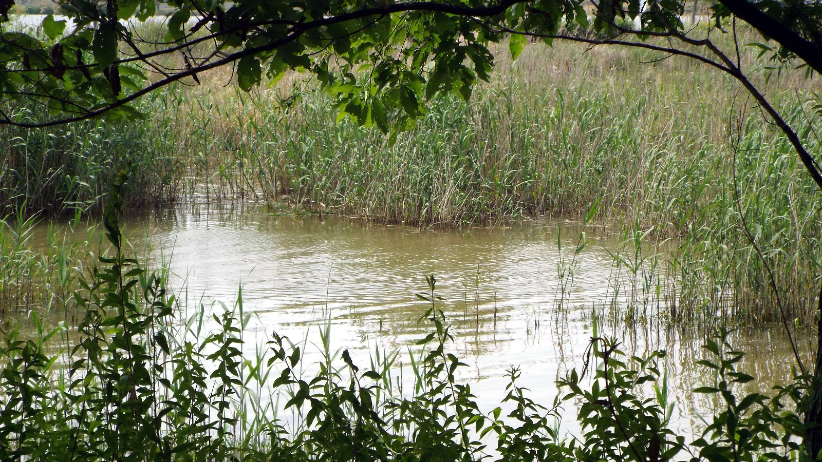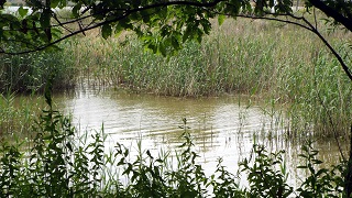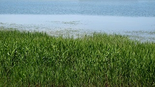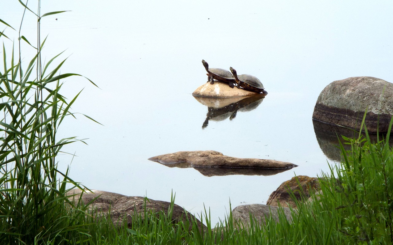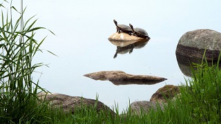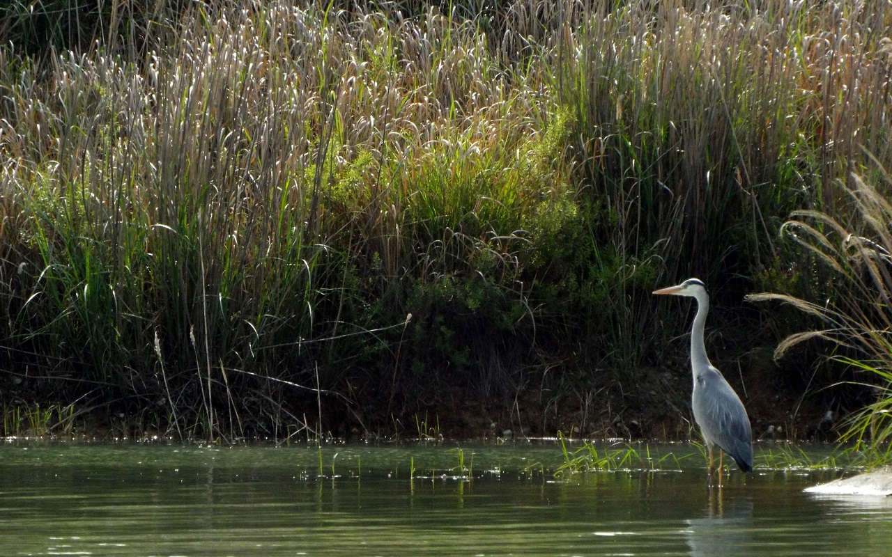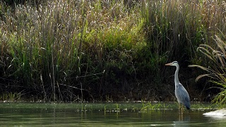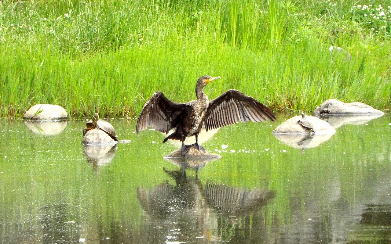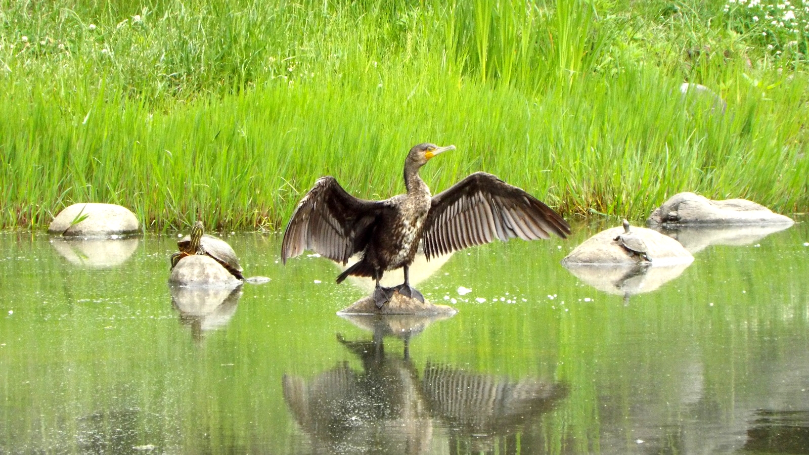 | 羽を乾かすカワウとミドリガメたち | 佇むアオサギ | ||